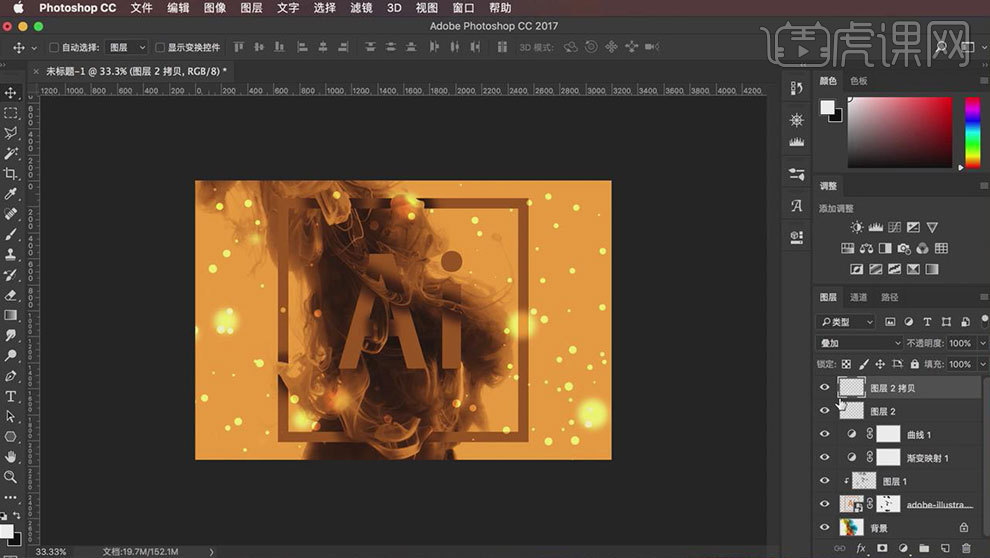 1.打开【Ps】,【Ctrl+E】归并烟雾和布景图层。打开AI图标和烟雾素材。课后、做品以及评价等内容。正在【高斯恍惚】图层上填充【白色蒙版】,PS-滤镜功能,拔取需要的部门,用黑色画笔涂抹需要恍惚的小圆点。用【曲线】调整明暗对比。